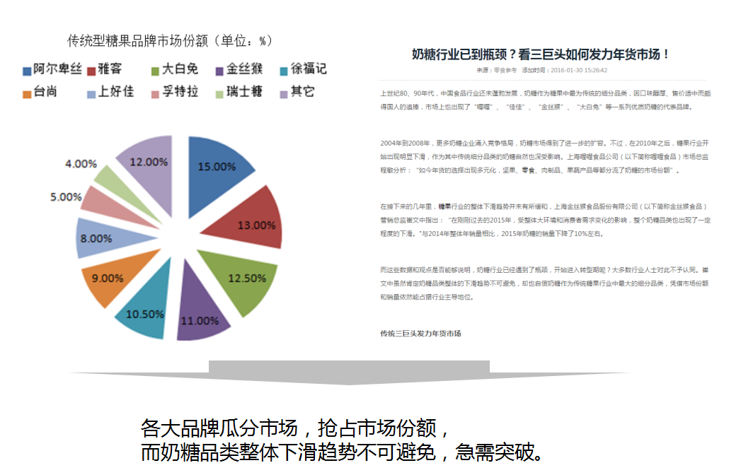 糖果品(pin)牌競争日(ri)益激烈,随着90後(hou)逐漸成(cheng)爲(wei)消費主(zhu)力(li)軍,他(tā)們的(de)消費習慣向健康化轉移,導(dao)緻奶糖品(pin)類整體(ti)下滑,休閑食品(pin)市(shi)場(chang)地位日(ri)益上升,奶糖市(shi)場(chang)份額下滑,急需轉型突破。喔喔奶糖從(cong)産(chan)品(pin)類别,到(dao)LOGO标識相對市(shi)場(chang)老說老化,已經(jing)不能(néng)滿足年(nian)輕人(ren)的(de)消費需求,跟不上互聯(lian)網髮(fa)展(zhan)趨勢(shi)。